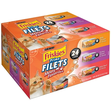 Let your cat choose from her favorite entrees at mealtime with this Purina Friskies Prime Filets Meaty Favorites wet cat food variety pack. Three different recipes bring the tastes of real beef, chicken and turkey to her dish, giving her more of the tastes she loves. ... Fetch Full Source
